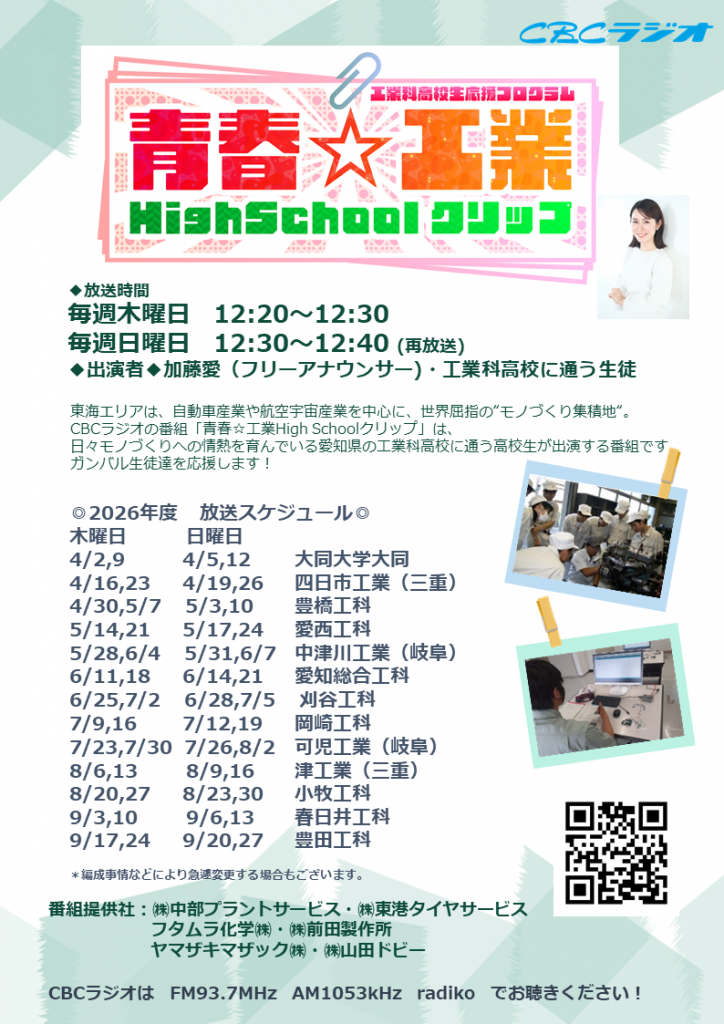 5/14(木)、5/21(木)にCBCラジオ「青春☆工業ハイスクールクリップ」にて、