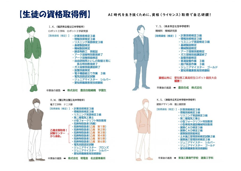 また、卒業生のコメントも載っていますので、「3年間どんな学校生活が送れるの?」、「普通科や商業科の高校にはない、愛西工科の魅力は何があったの?」など、愛西工科へ入学後をイメージする参考になります。